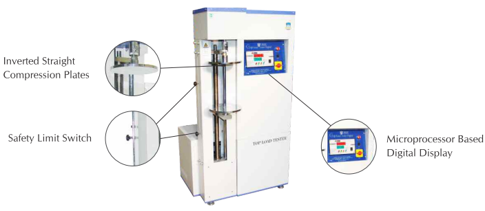 A digital top load tester provides precise and automated compression testing. It uses sensors and digital displays to record real-time data on applied force, deformation, and maximum load.